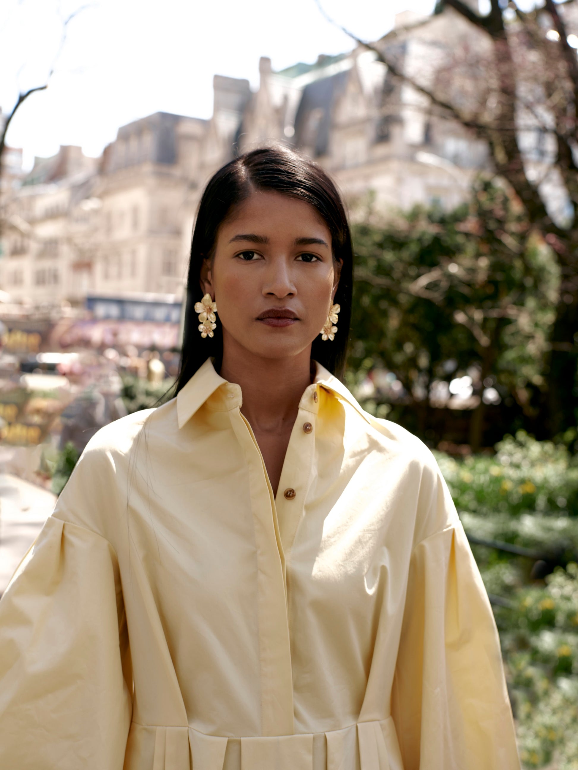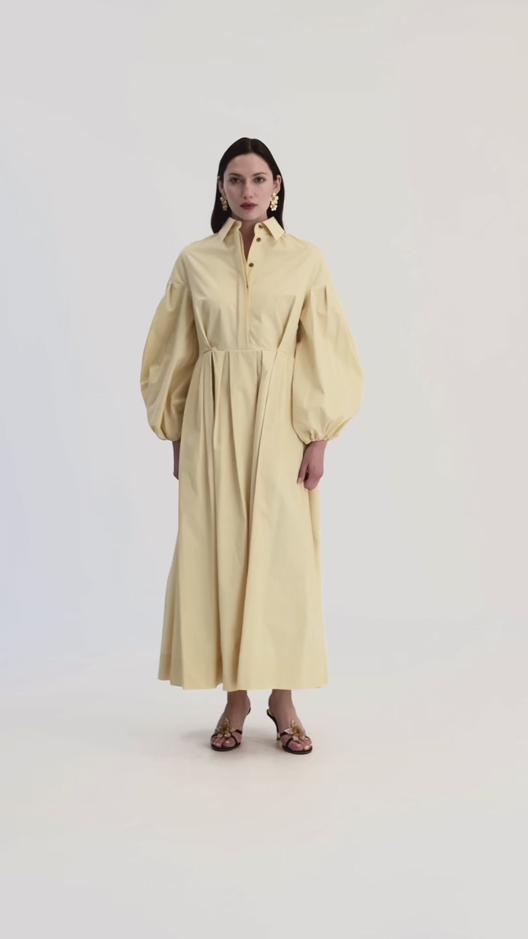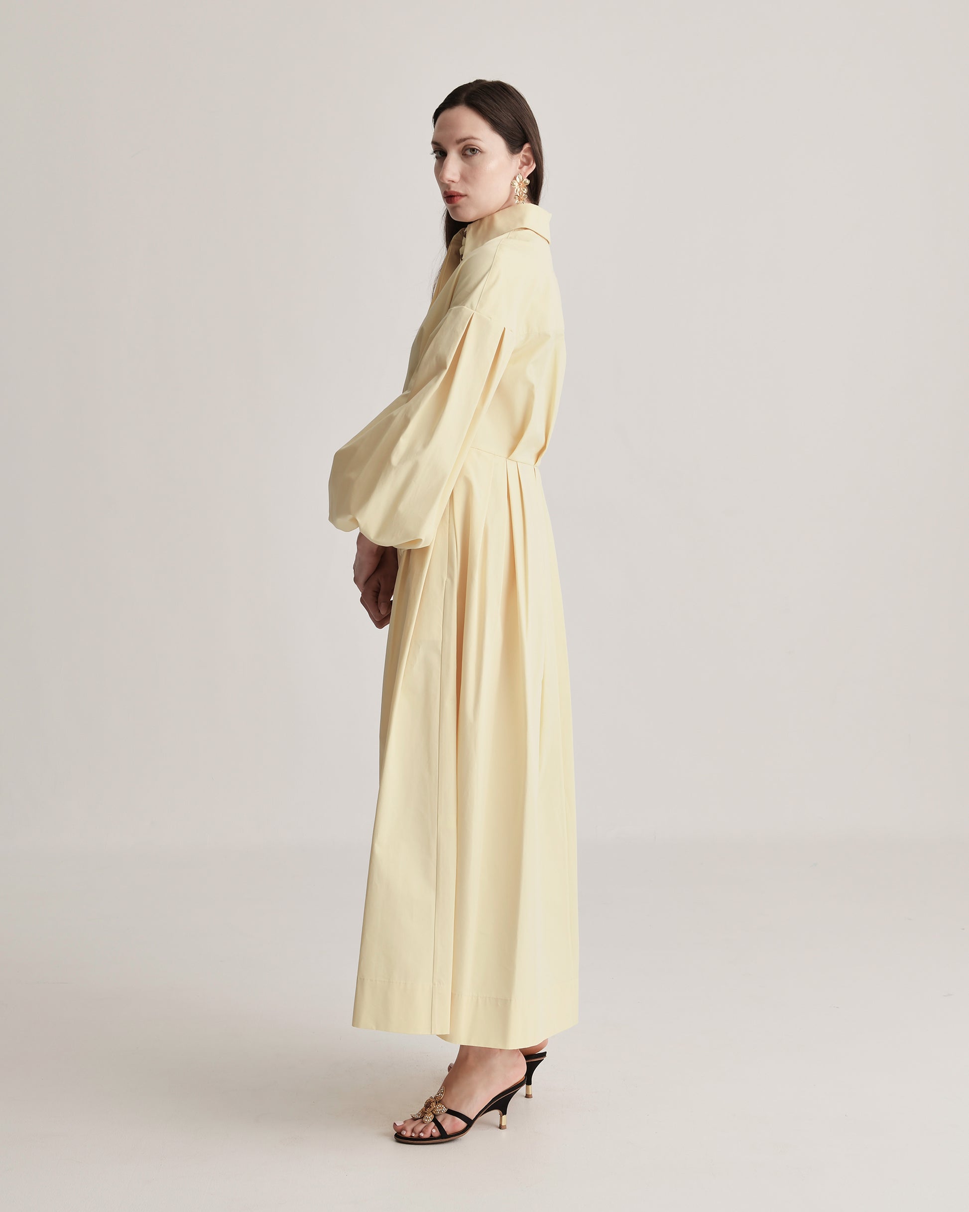 Crafted in crisp Cotton Poplin imported from Italy, this dress features an oversized fit, dropped shoulder, and voluminous puff sleeves to create a relaxed yet refined look. Hand done symmetrical pleats throughout the dress work to balance the fullness at the sleeve cap and skirt. Finished off with a button-down hidden placket, spread collar, and side seam pockets. We recommend getting one size down.