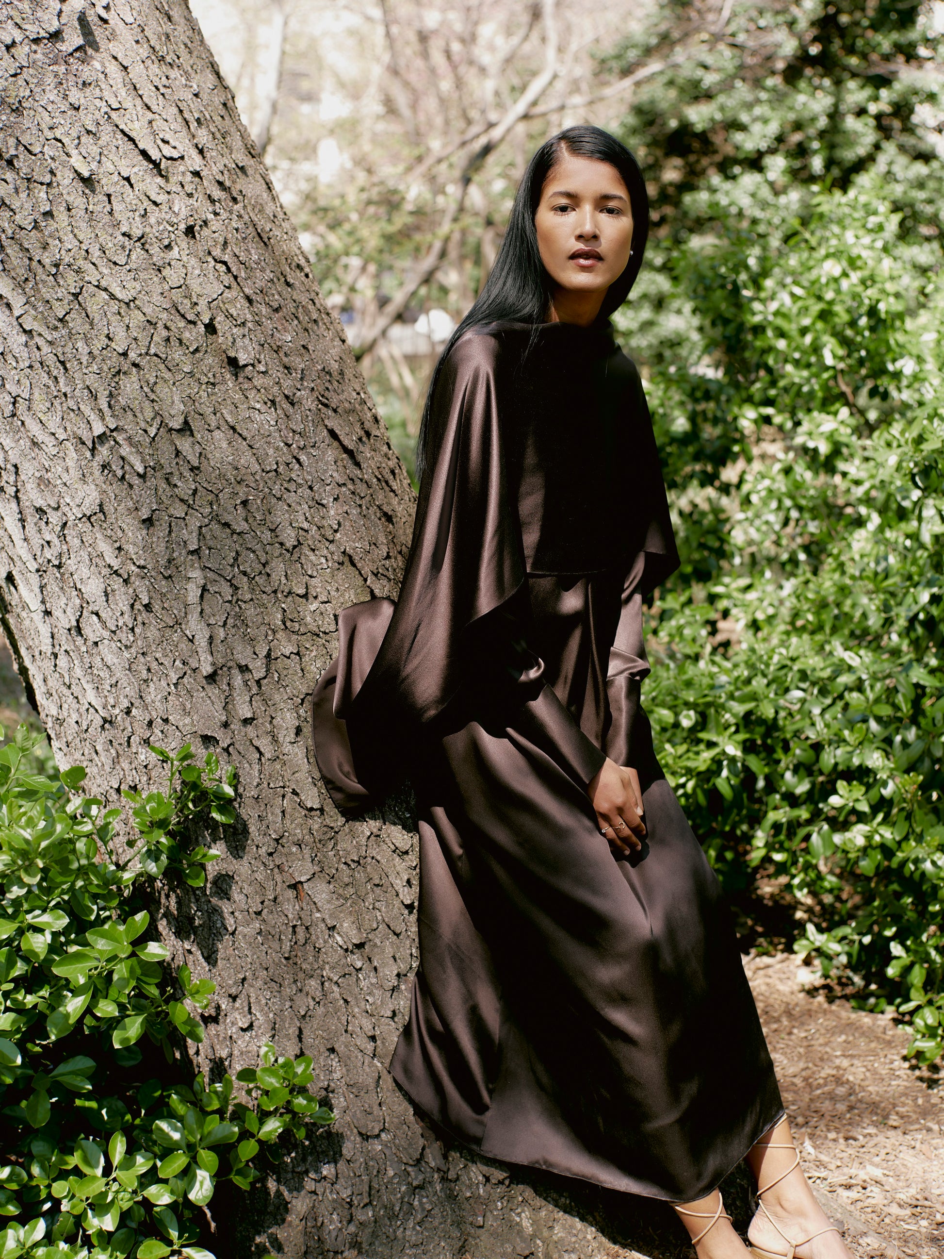 Our long dress with attached scarf in sumptuous silk charmeuse, enhanced with soft gathers at the neckline and elongated cuffs complete with a silk covered button. Attached scarf loop to secure one side of the scarf to help you effortlessly style it multiple ways. Pull the scarf completely back to showcase the soft gathers, or let one side drop and drape for added modesty.